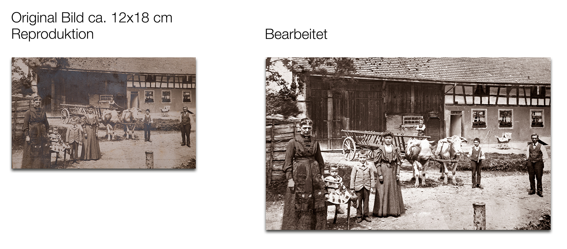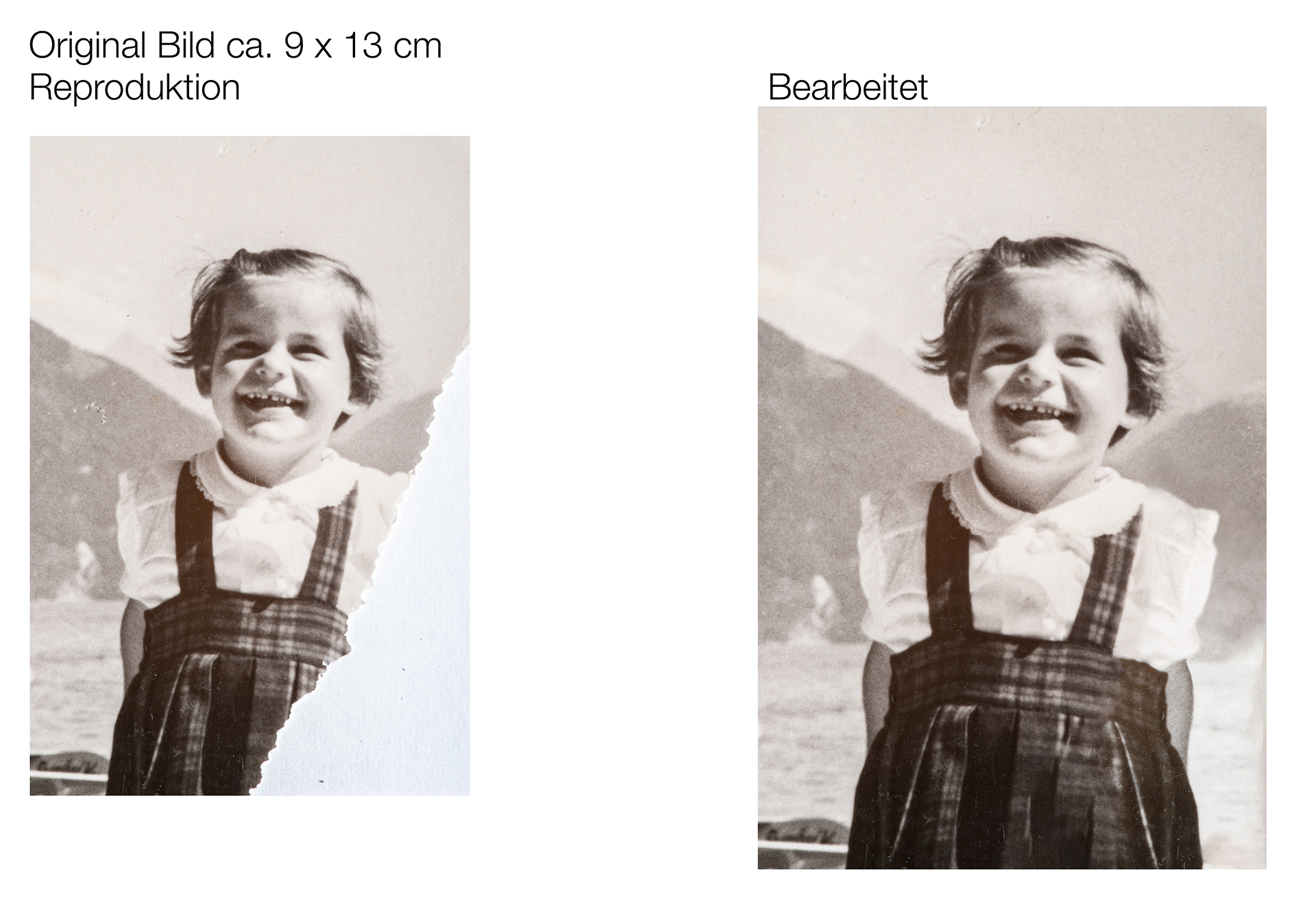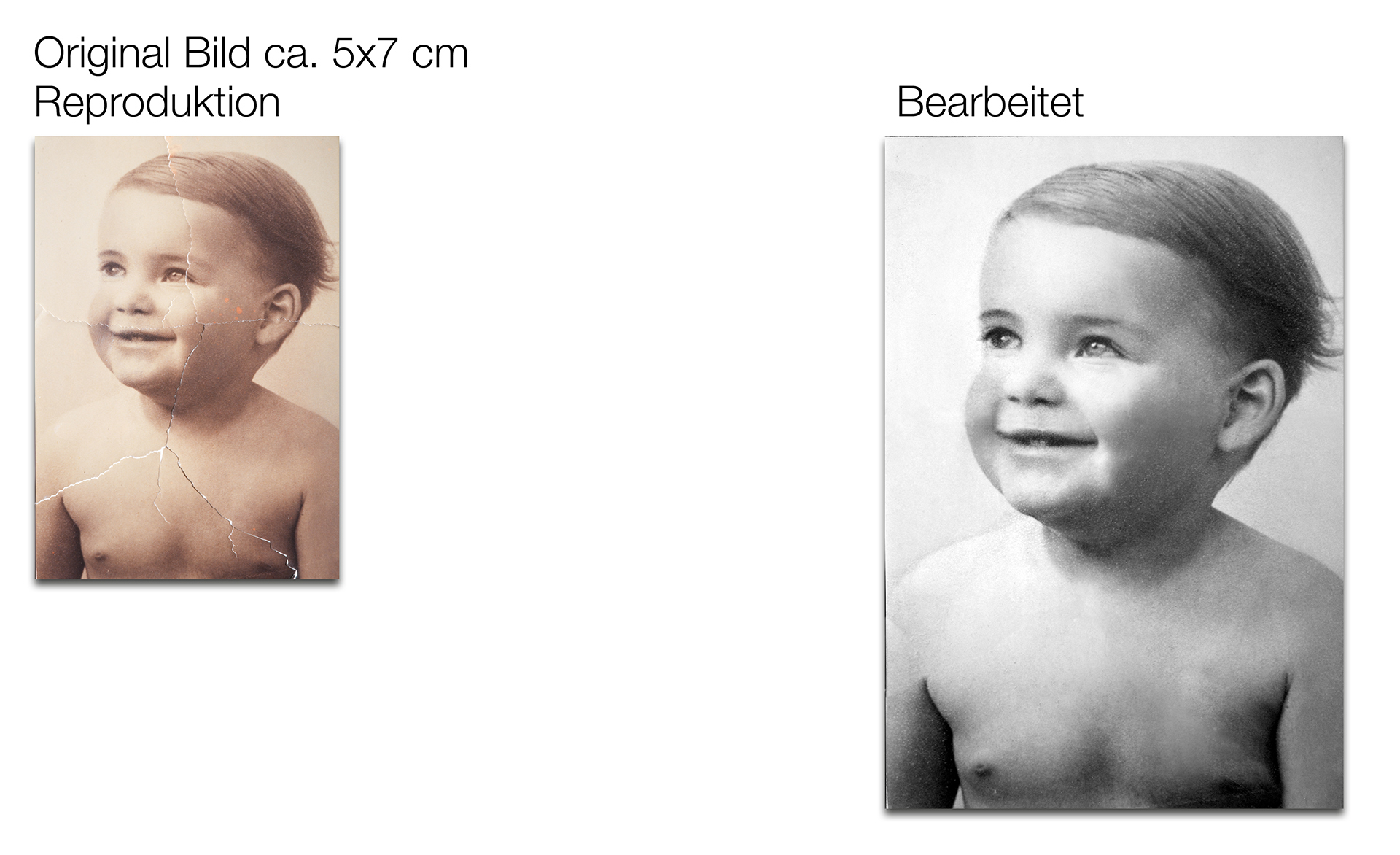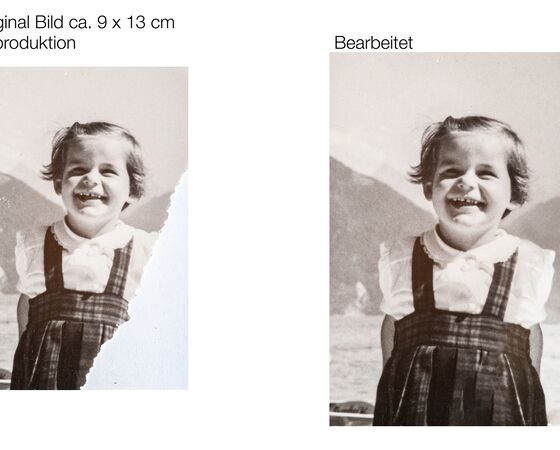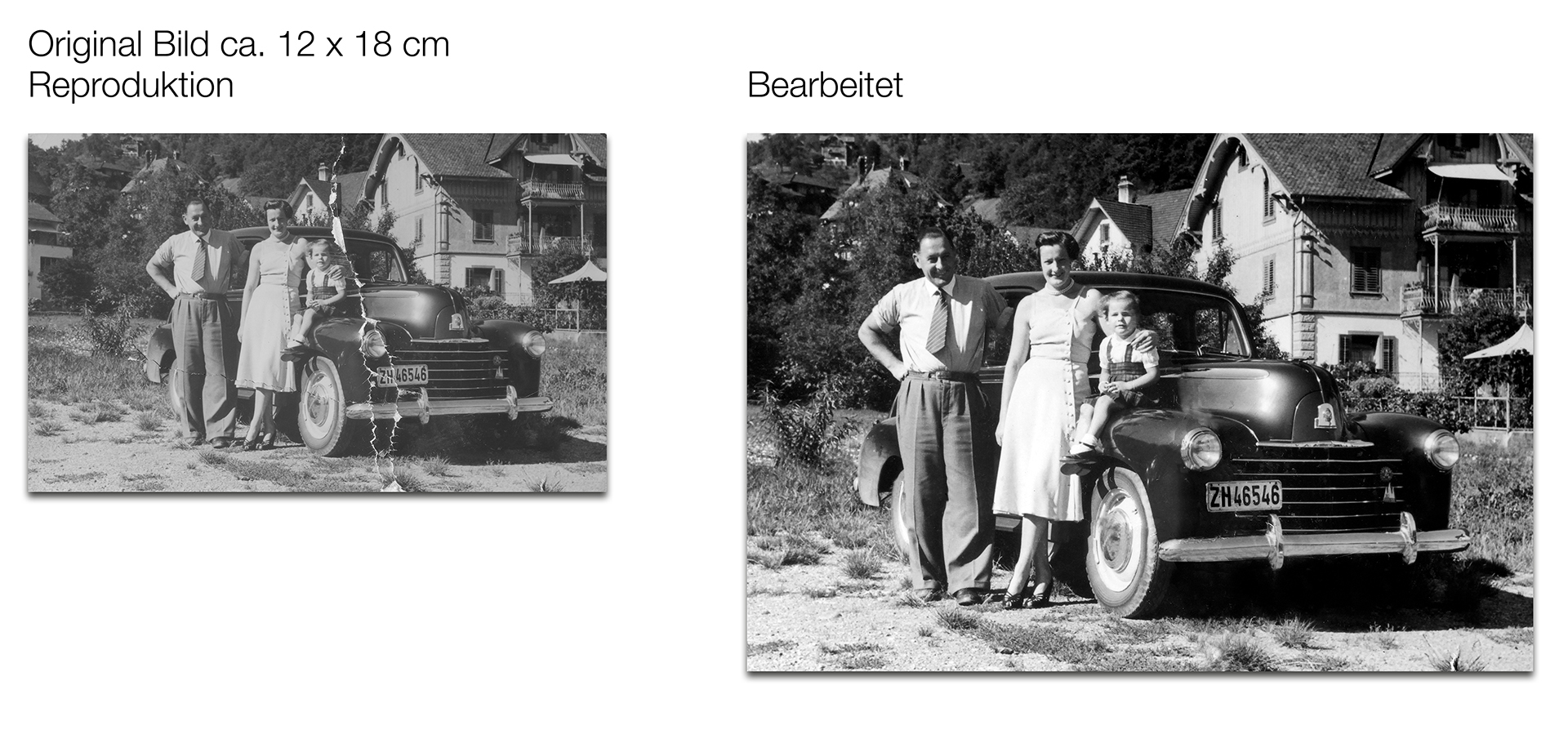 Nichts ist für immer geschaffen, aber der Fotograf kann das bestehen von Bilder und Dokumenten auffrischen und deutlich verlängern. Der Zahn der Zeit nagt ganz im Stillen, Bilder werden beschädigt, verlieren Farben und verblassen fast ganz...?! So lange etwas in seinen Grundelementen noch erkennbar ist, nimmt der Fotograf diese Herausforderungen gerne an. Mit all seiner Erfahrung, den entsprechenden Geräten und grosser Hingabe, repariert er verloren geglaubtes zu neuem Erscheinen. Lassen Sie sich überraschen.