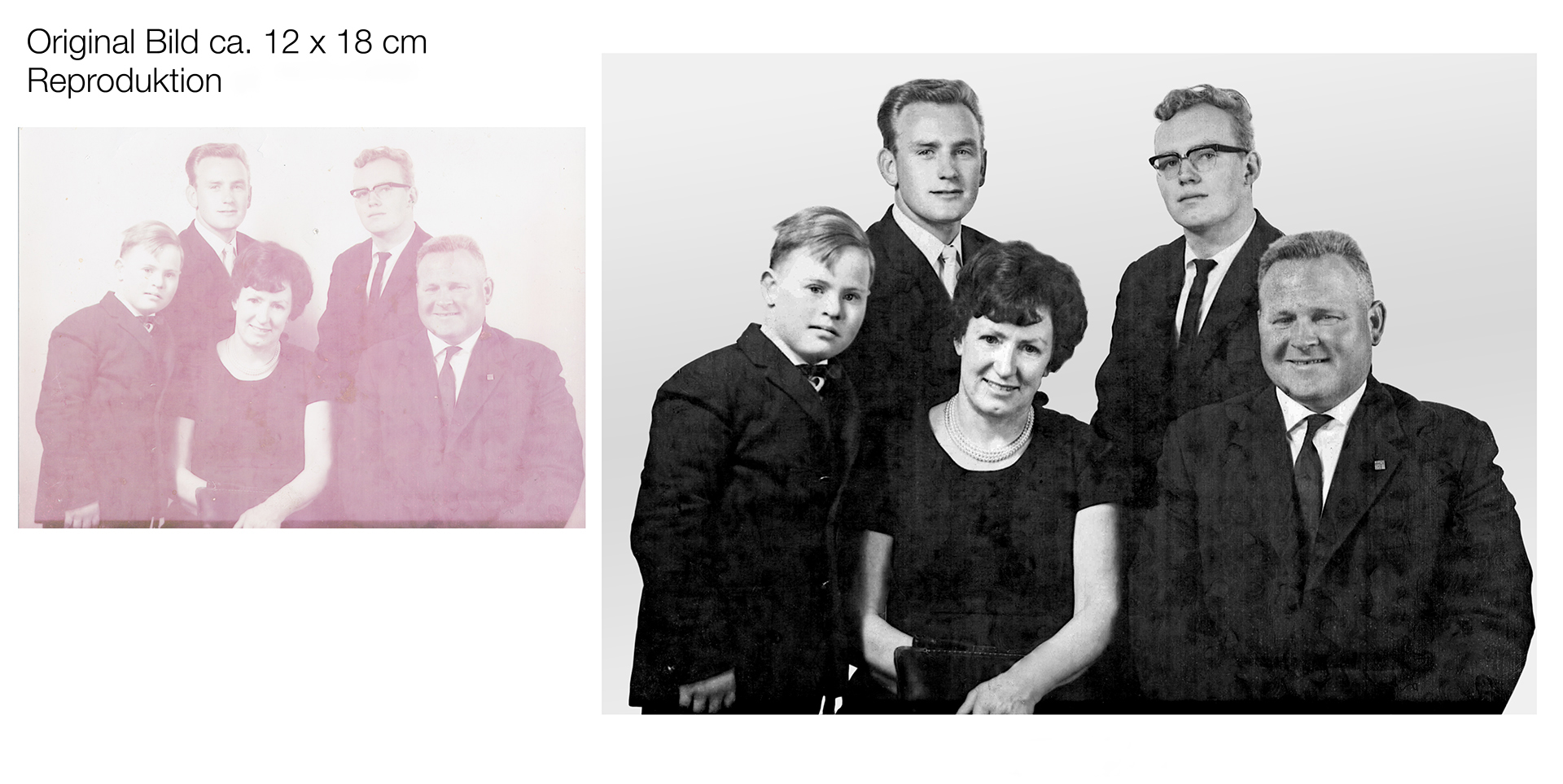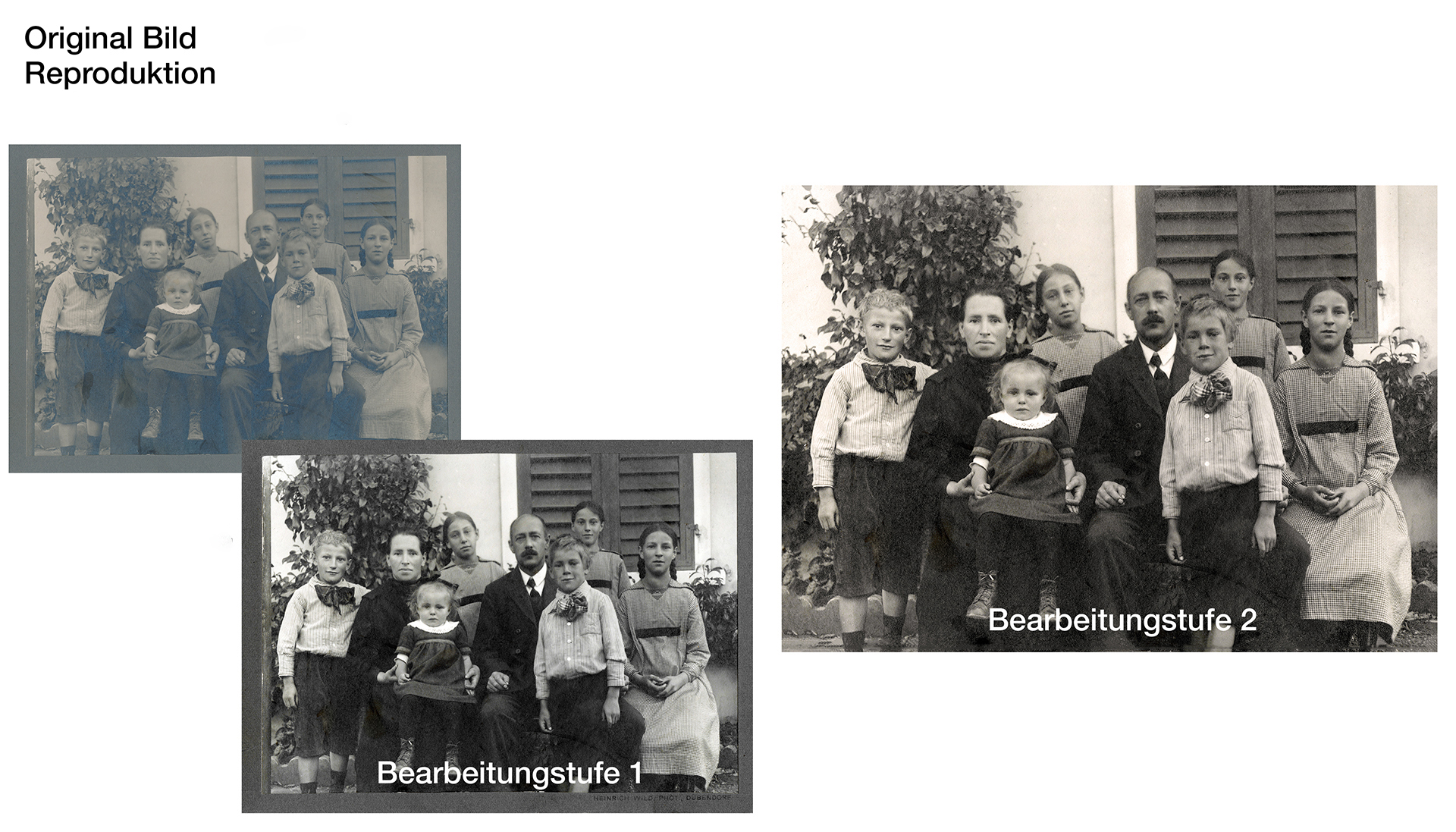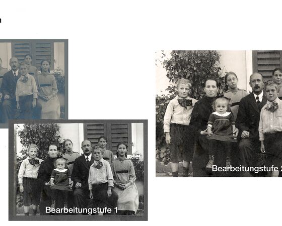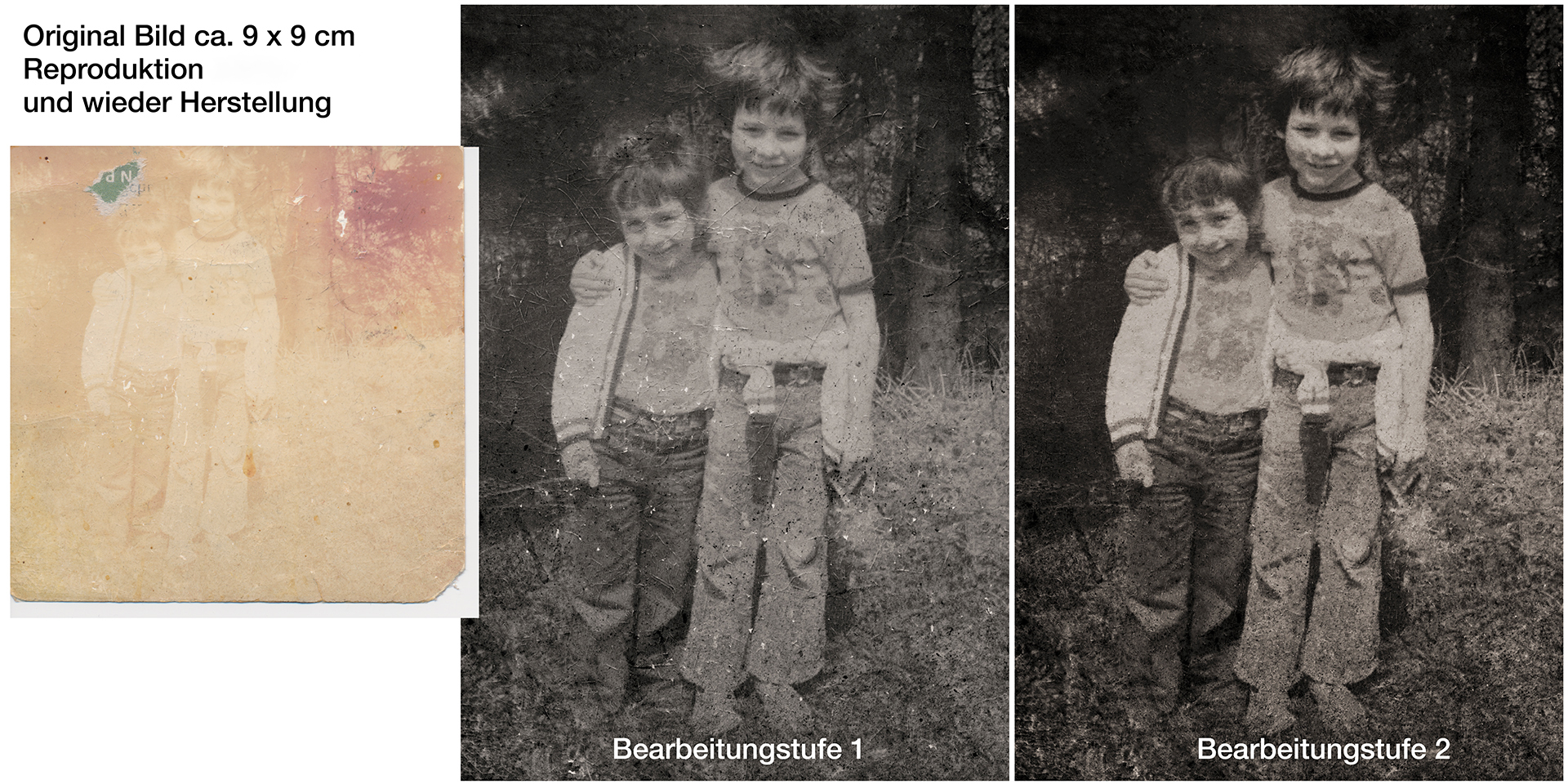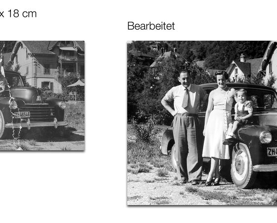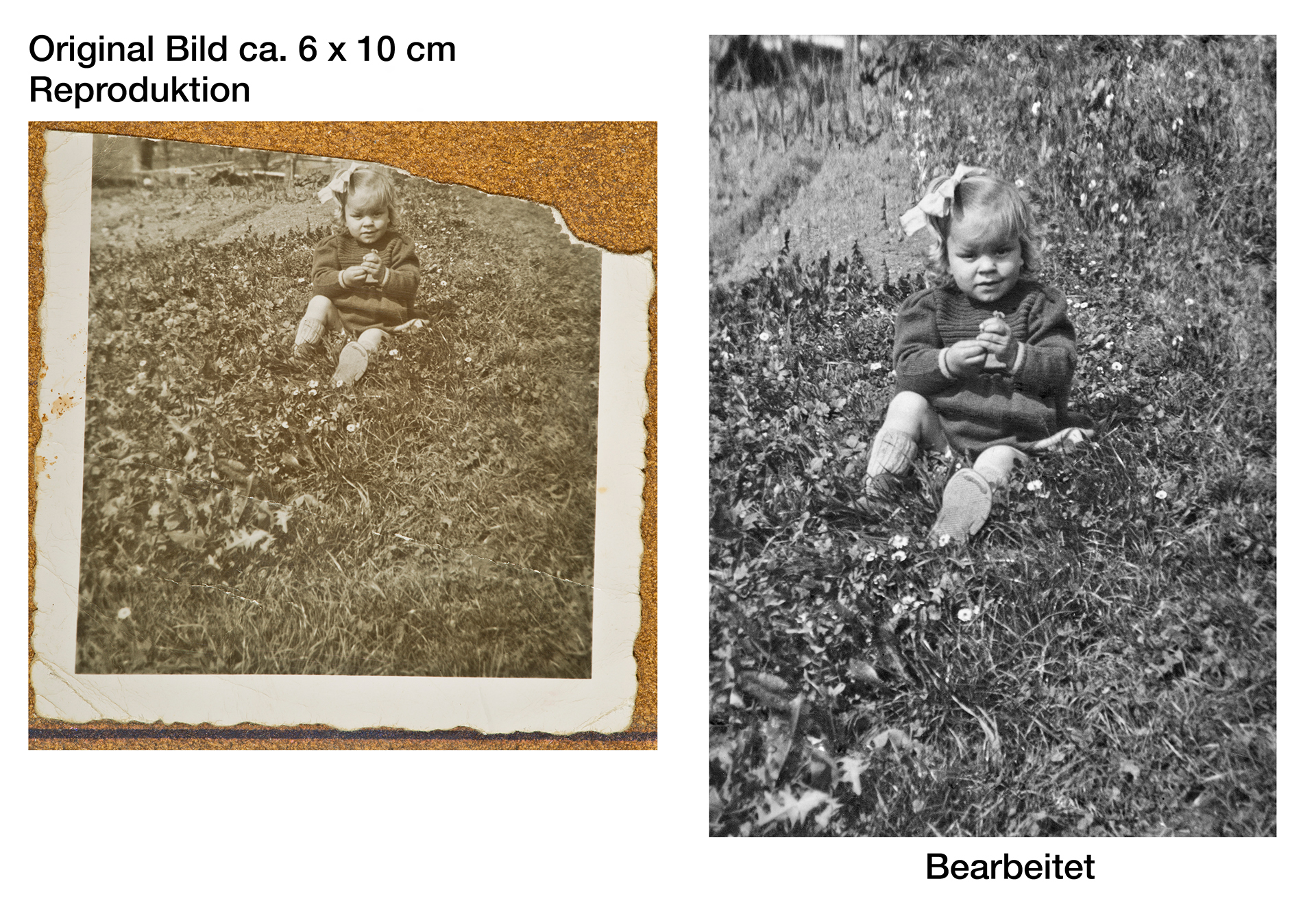 Nichts ist für immer geschaffen, aber der Fotograf kann das bestehen von Bilder und Dokumenten auffrischen und deutlich verlängern. Der Zahn der Zeit nagt ganz im Stillen, Bilder werden beschädigt, verlieren Farben und verblassen fast ganz...?! So lange etwas in seinen Grundelementen noch erkennbar ist, nimmt der Fotograf diese Herausforderungen gerne an. Mit all seiner Erfahrung, den entsprechenden Geräten und grosser Hingabe, repariert er verloren geglaubtes zu neuem Erscheinen. Lassen Sie sich überraschen.